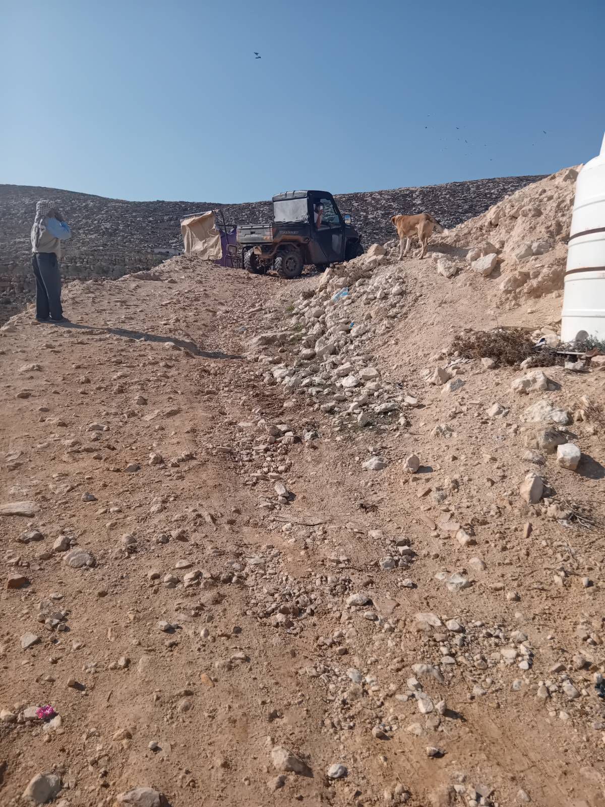 Last Saturday eight masked settlers armed with clubs dropped off during the night from a settler security van (kind of settler military still with authority to detain you) and stormed the family tents, injuring one of the kids at the head, injuries family and internationals
