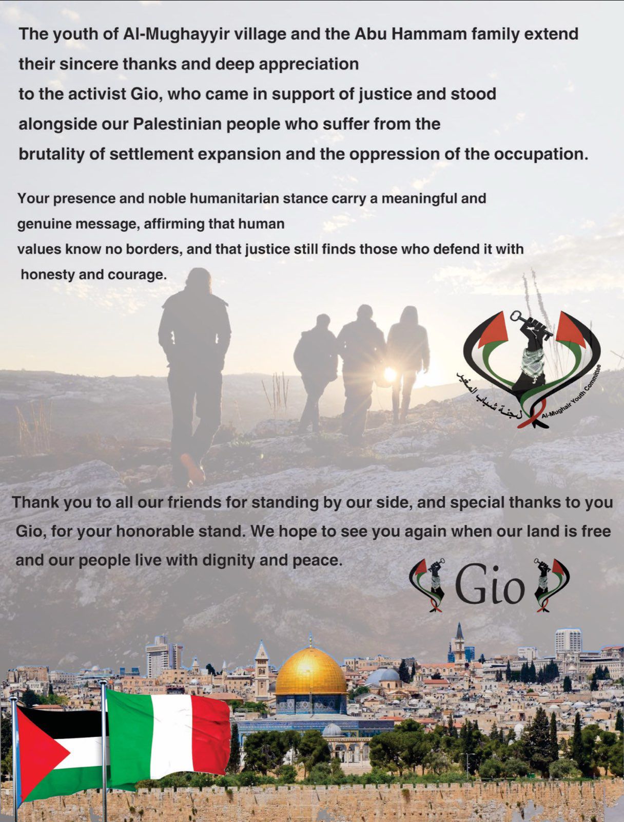 To follow scrutinized updates specifically about our work here refer instead to the website and social media of the International Solidarity Movement.