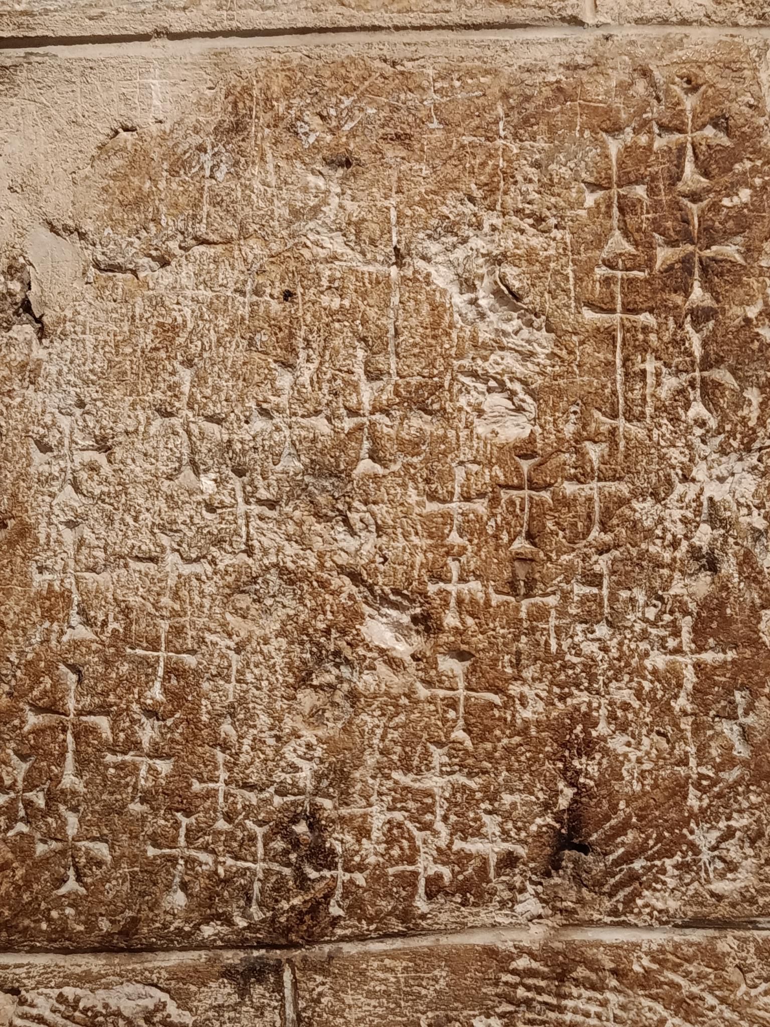 One obvious answer lies in this picture: crosses marked on the halls of the Church of the Holy Sepulchre by Crusaders in the Middle Ages.